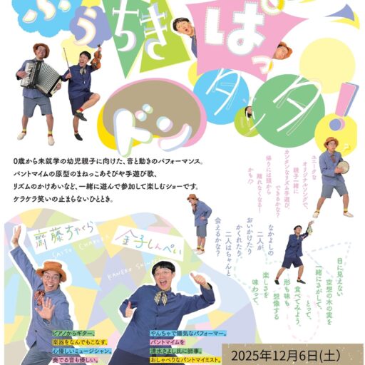 - 【12月6日(土)】0歳~年長親子対象 『しんぺいとちゃくらのぶうちきぱっドンタッタ!』【しんぺいとちゃくらのぶうちきぱっドンタッタ!】 0歳から未就学児の幼児親子に向けた、音と動きのパフォーマンス… 続きを読む: 【12月6日(土)】0歳~年長親子対象 『しんぺいとちゃくらのぶうちきぱっドンタッタ!』