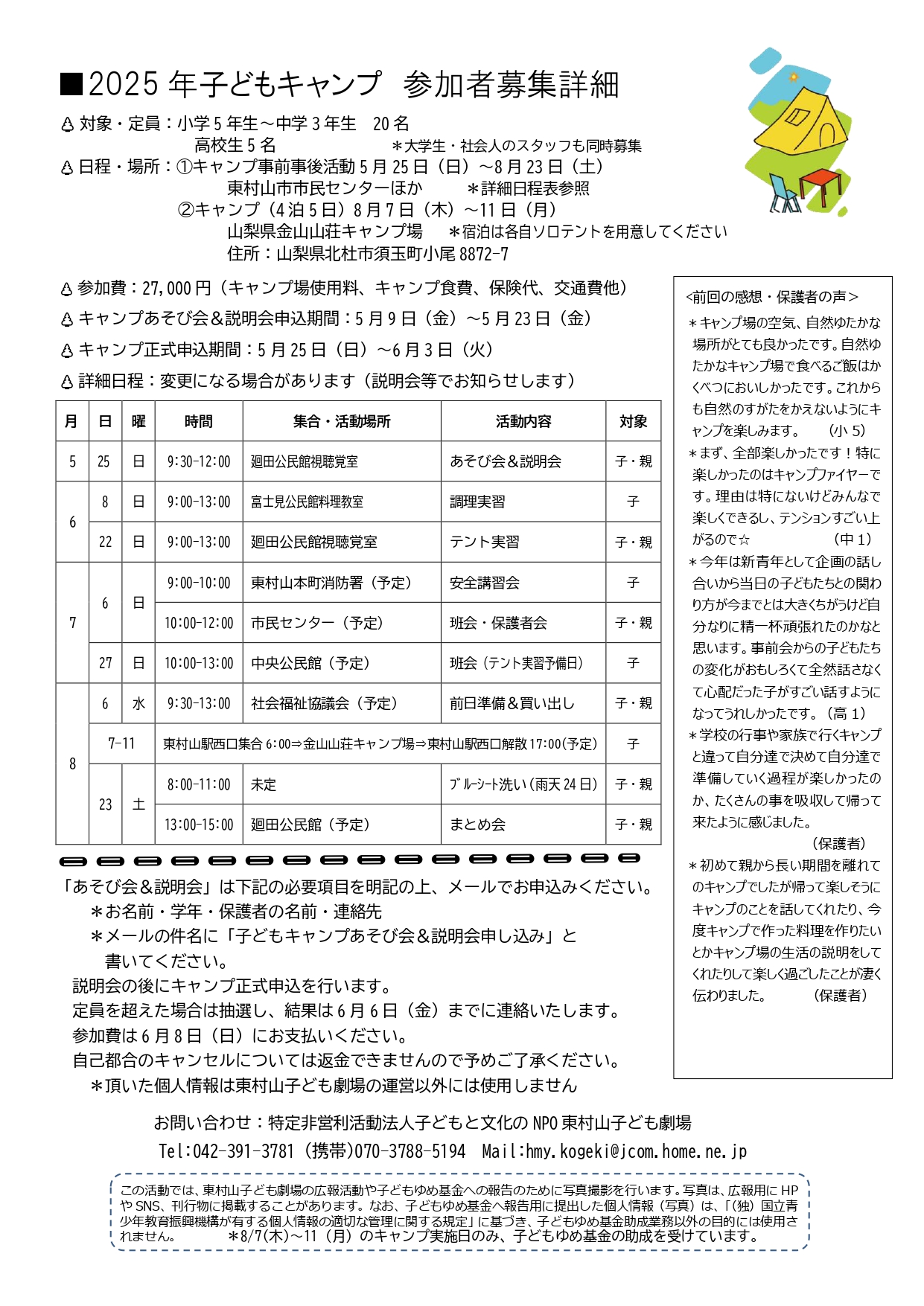 【参加費】27,000円(キャンプ場使用料、キャンプ食費、保険代、交通費他)