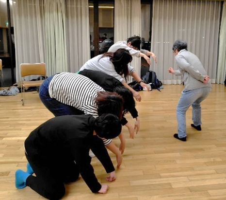 いつも会議や送迎や親子活動で顔を合わせているメンバーだけど、この日は大人同士でとことんあそぶ!導入、輪になって他愛のないあそびから始まりますが、既にいつもとちょっと違う空気、妙に解放され、ちょっとしたことがオモシロい。どうでもいいけど笑っちゃう。しまいには、箸が転がってもオカシイ年ごろに戻ったかのよう!そここで笑いの渦が発生、後から考えたら、何がそんなにオモシロかった?と思うくらい、よく笑った時間になりました。終わったあとは、心もからだも何だかスッキリ!