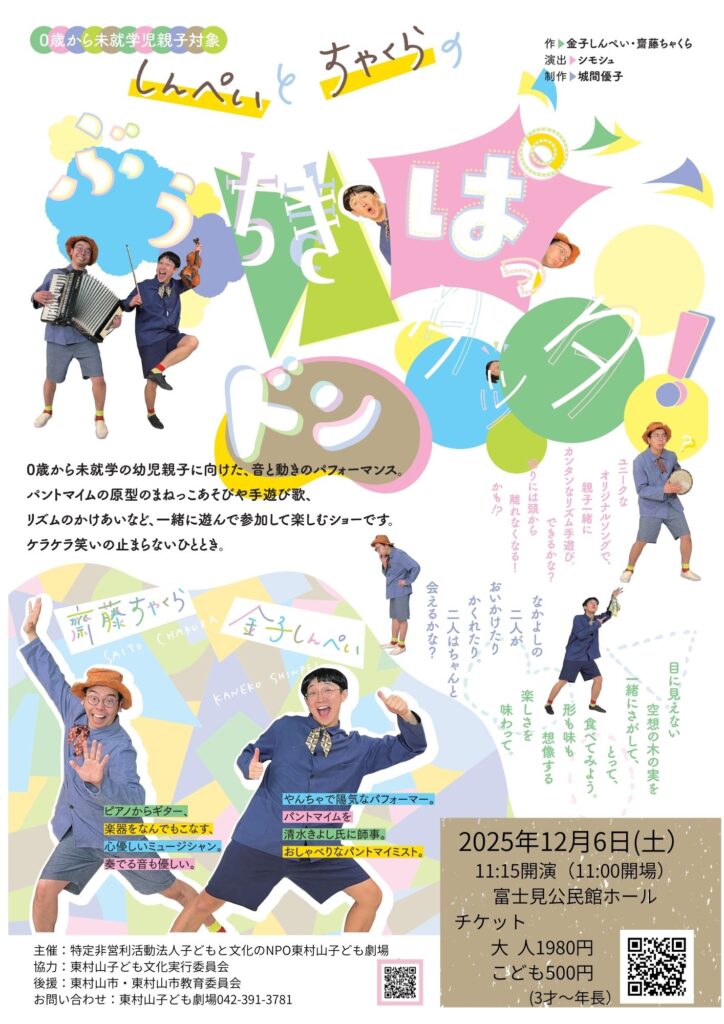 0歳から未就学児の幼児親子に向けた、音と動きのパフォーマンス。パントマイムの原型のまねっこあそびや手遊び歌、リズムのかけあいなど、一緒に遊んで参加して楽しむショーです。ケラケラ笑いの止まらないひととき。
