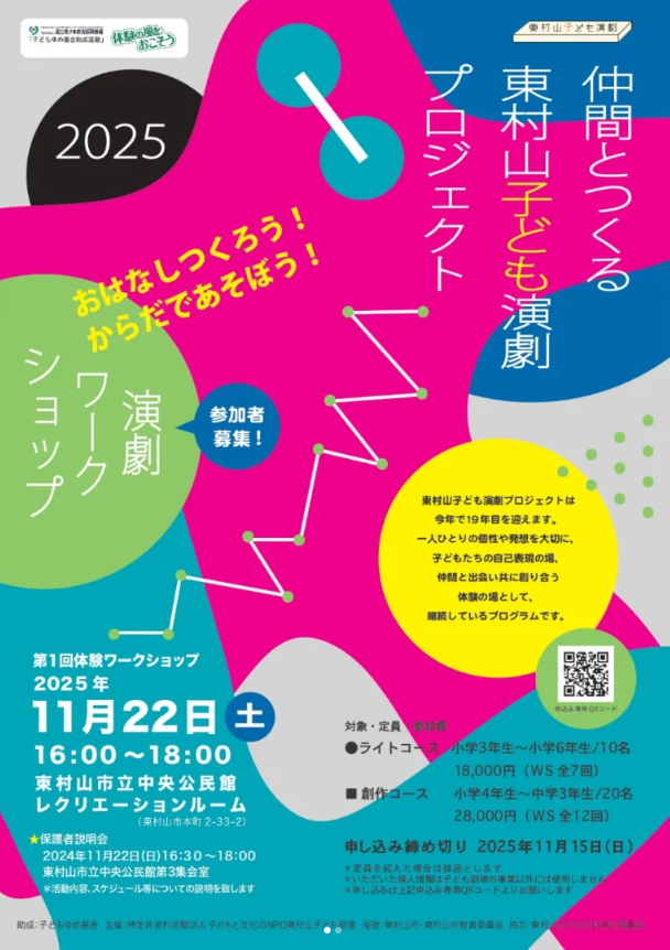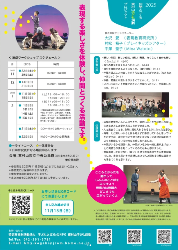 東村山子ども演劇プロジェクトは今年で19年目を迎えます。一人ひとりの個性や発想を大切に、子どもたちの自己表現の番、仲間と出会い共に創り合う体験の場として継続しているプログラムです。