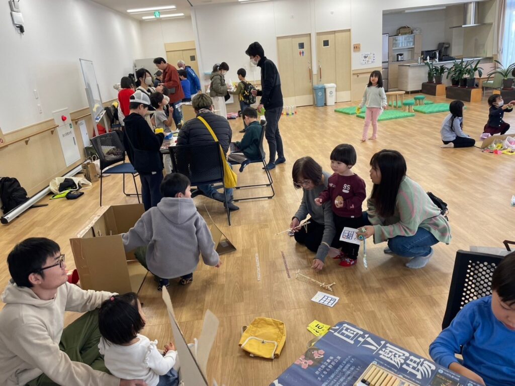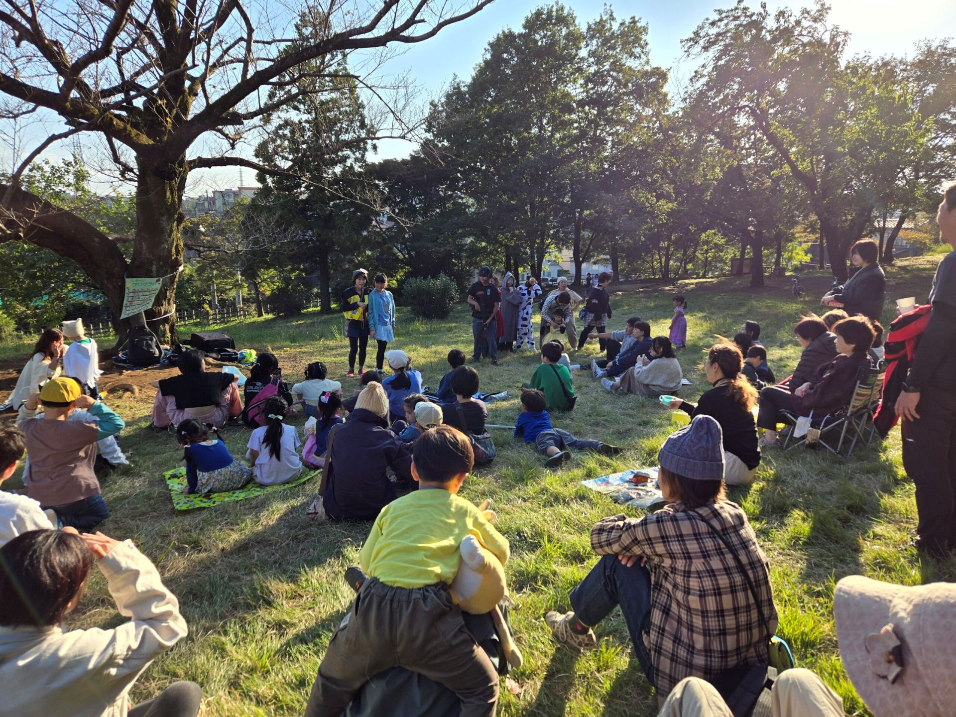 八国山で劇場まつり。小学生の風呂敷市、あそびコーナーやバンド演奏、仮装やひろばあそびなど!会員たちがやりたいことを持ち寄るアットホームなおまつりです。